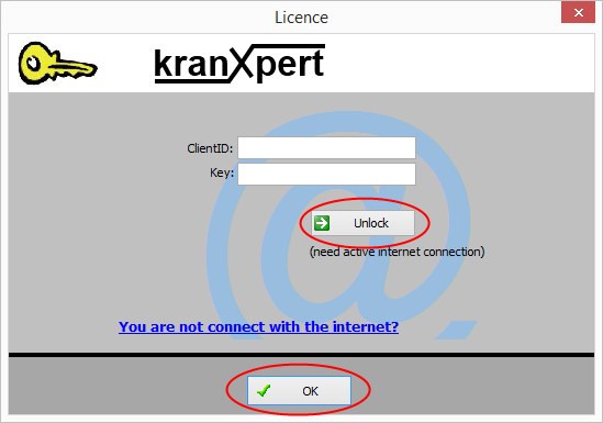 Input your kranXpert CustomerID and your license Key (the key start with CD...) then click on the 'Unlock' button to activate kranXpert.