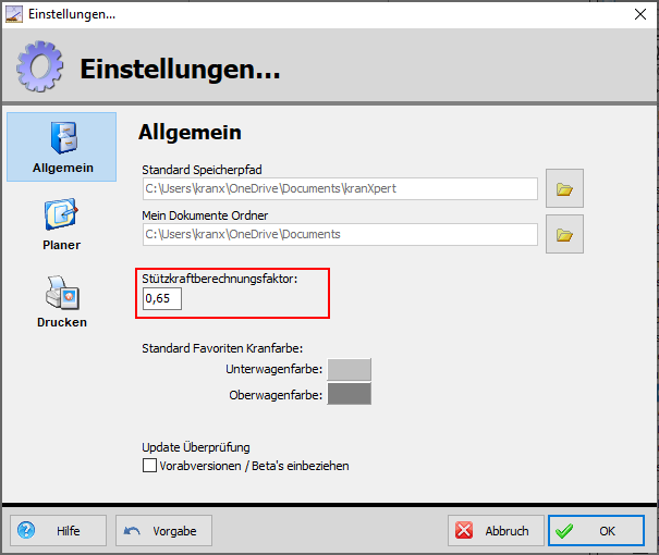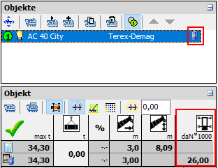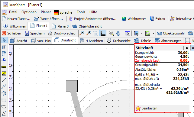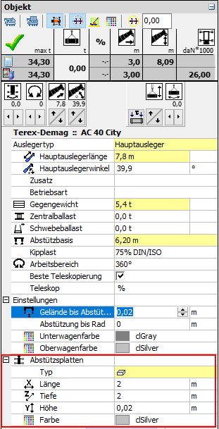 Die Abstützplattenfläche wird im Planer bei den Kraneigenschaften angegeben.