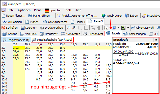 es zeigt die Stützkraft bei den Objektddetails basiered auf der Auslegerlänge und dem Radius.Die Hersteller Stützkraftangaben passieren auf Stützkrafttabellen wie bei den Traglasttabellen. Sie können die Stützkrafttabellen ansehen wenn Sie im Planer die Ansicht 'Tabelle' auswählen, nun können Sie von der 'Traglasttabelle' auf die 'Stützkrafttabelle' wechseln.